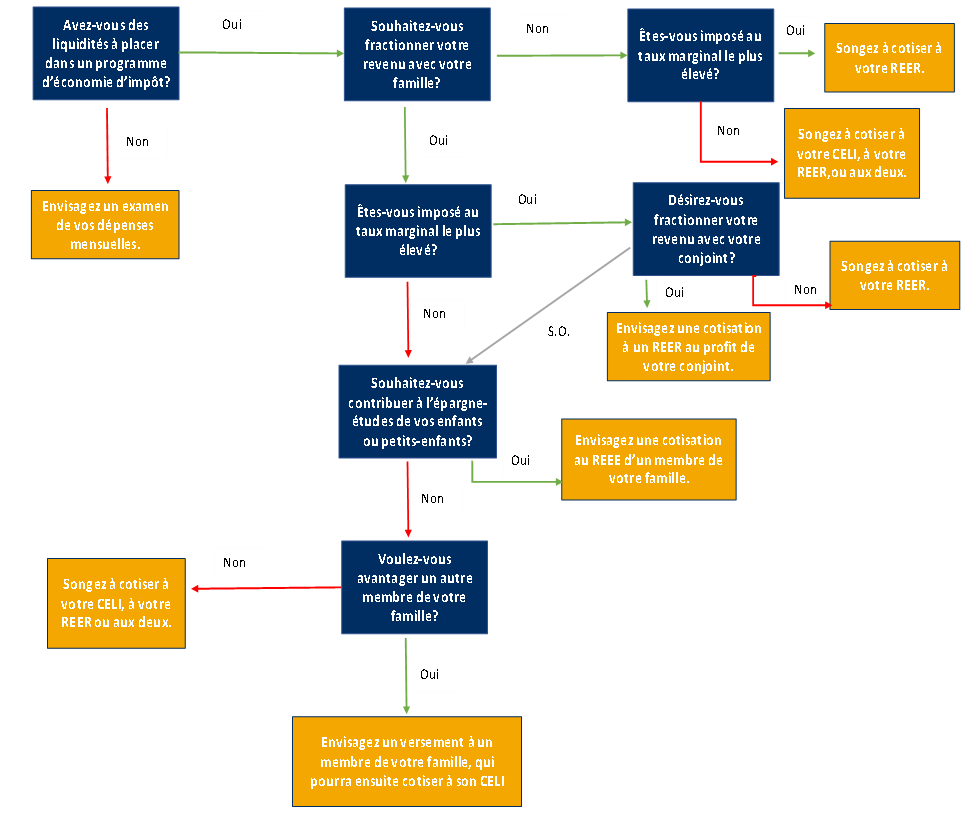 Nous vous invitons à consulter l’arbre décisionnel ci-dessous pour avoir une idée du régime qui convient le mieux à vos objectifs d’épargne. Ce diagramme vous éclairera sur les avenues possibles, mais nous vous recommandons de communiquer avec votre conseiller Crowe BGK avant d’aller de l’avant, car la bonne décision passe par une analyse complète de votre situation.