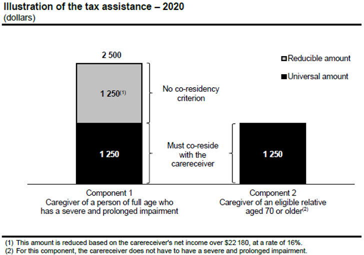 As of 2020, a caregiver who paid respite expenses in respect of a carereceiver having a severe and prolonged impairment in mental or physical functions can claim an additional amount under the refundable tax credit for caregivers. This assistance for respite expenses will be equal to 30% of total qualifying expenses up to $5 200 and will no longer be reducible.