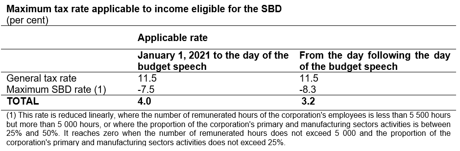 To further ease the tax burden on SMBs, the current SBD rate will be raised so that the maximum rate available to a corporation for the period that begins on the day following the day of the budget speech is 8.3%, which lowers the tax rate applicable to the first $500 000 from 4% to 3.2%, as illustrated in the table below:
