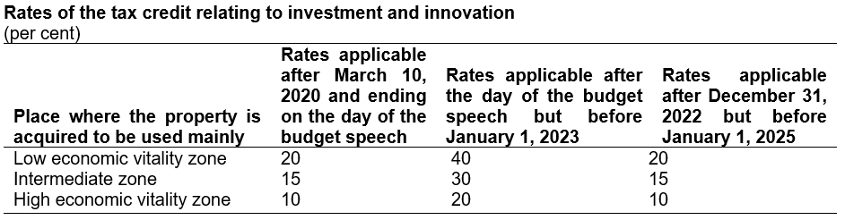 In order to encourage the realization of investment projects and to stimulate Québec's economic recovery, the tax credit relating to investment and innovation will be temporarily increased.
