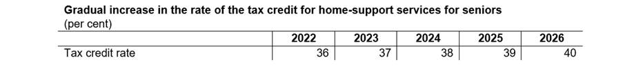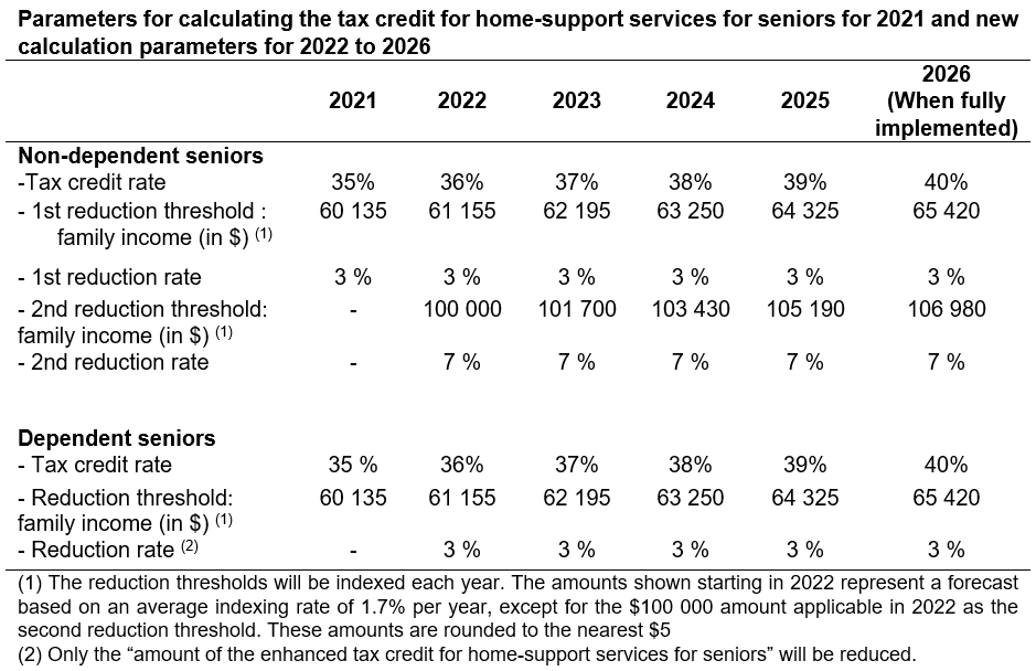The following table illustrates the year-to-year application of the enhanced rate of the tax credit for home-support services for seniors and new reduction terms based on family income, for both non-dependent and dependent seniors.