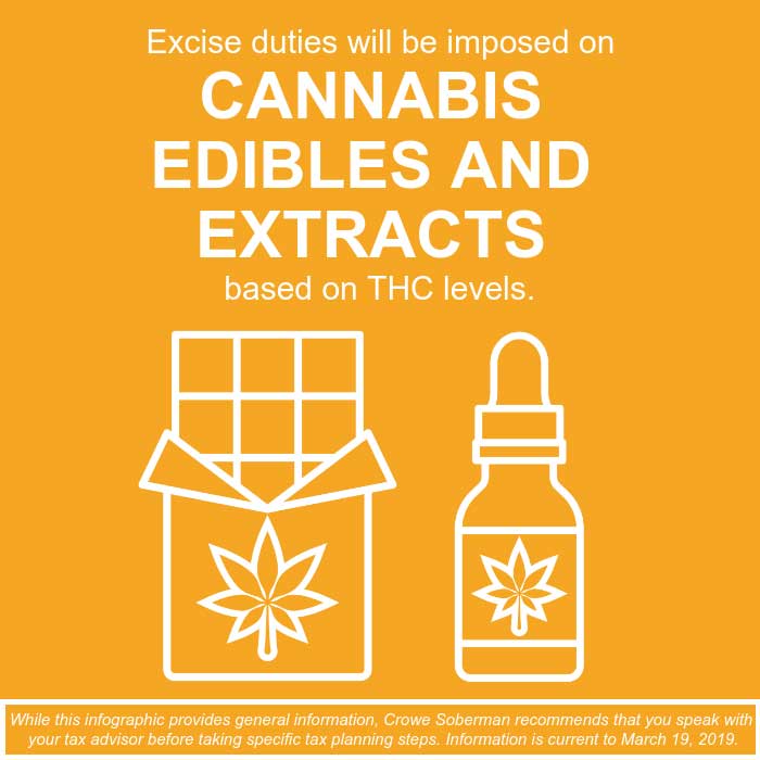 Later this year, edible cannabis, cannabis extracts and cannabis topicals will be permitted for legal sale under the Cannabis Act. Budget 2019 proposes to impose excise duties on these products (including cannabis oils) based on the quantity of tetrahydrocannabinol (THC) contained in the final product. The THC-based duty will be imposed at the time of packaging of a product and become payable when it is delivered to a non-cannabis licensee such as a provincial wholesaler, retailer orindividual consumer.The combined federal-provincial territorial THC-based excise duty rate for cannabis edibles, cannabis extracts (including cannabis oils) and cannabis topicals is proposed to be $0.01 per milligram of total THC.