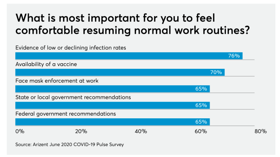 Una disminución en las tasas de infección es el factor más importante para que los empleados se sientan cómodos al reanudar las operaciones más normales, pero también califican el desarrollo de una vacuna, el uso de mascarillas y el cumplimiento de las recomendaciones federales y estatales.