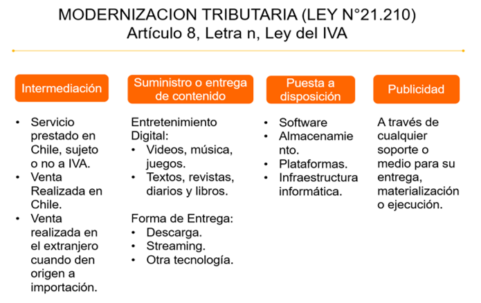 La Ley N°21.210, de fecha 24 de febrero de 2020, incorporo varias modificaciones a la Ley del IVA, dentro de ellas, introduce un nuevo hecho gravo especial de servicios, realizados o prestados por personas domiciliados o residentes en el extranjero, agregando la letra n, en el artículo 8.