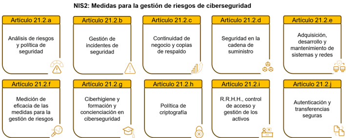 A continuación, se detallan las principales medidas de seguridad que deben aplicar las entidades conforme a NIS 2: