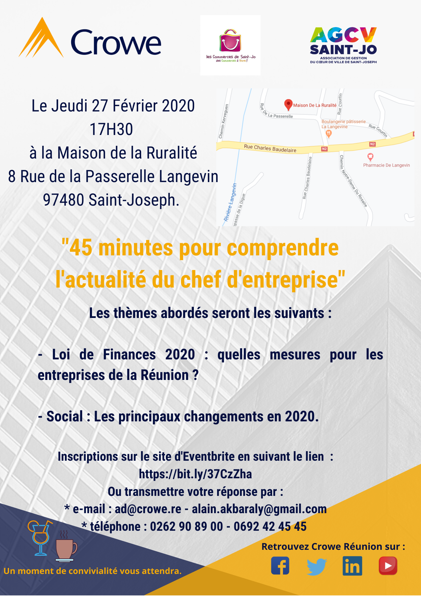 L'association de Gestion du Cœur de Ville de Saint-Joseph - l'association des commerces de Saint-Joseph des commerces à vivre & CROWE Reunion, vous invitent à participer à l'actualités du chef d'entreprise 2020.