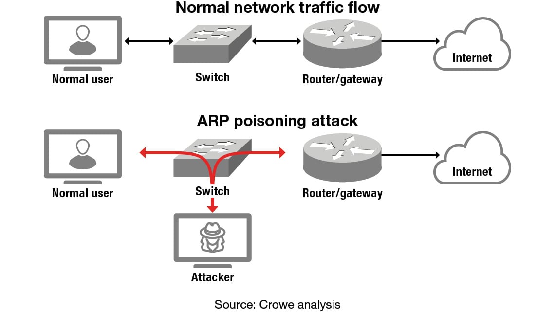 The abuse of ARP – known as ARP poisoning, spoofing, and flooding – has been in use for more than two decades and as such has been well documented. In an ARP poisoning attack, attackers flood a network switch with so many entries for device-to-address pairings that the attackers eventually overwrite the original entries and can assign addresses as they please. This method allows attackers to gain a man-in-the-middle position. From this position on the network, attackers can send and receive traffic intended for other devices and therefore become privy to all the information held within that traffic.
