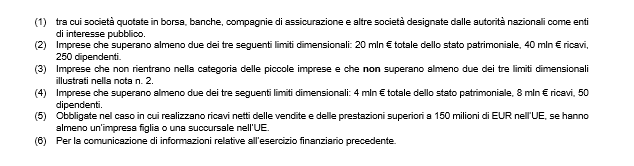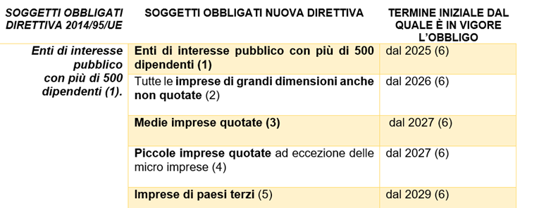 Per tali categorie di imprese sarà necessario dai prossimi anni comunicare agli investitori, ai clienti e a tutti gli stakeholder, informazioni che riguardano fattori ambientali (es. mitigazione dei cambiamenti climatici, uso delle risorse, inquinamento ecc.), sociali (es. parità di genere, condizioni di lavoro, rispetto dei diritti umani ecc.) e inerenti alla governance (con particolare focus sugli organi di amministrazione, gestione e controllo, etica aziendale e lotta alla corruzione).