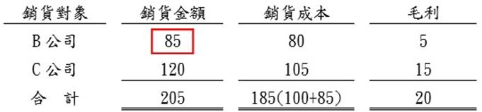 (2)A公司為虛增營收,透過交易安排將原料以85元出售予B公司,並約定以105元(加工成本20元加計墊高之原料價格5元)將加工後之成品買回,最終自以120元出售予C公司,經安排後於財務報表認列之收入及成本如下: