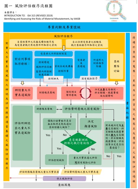 2.本公報強調,對受查者及其環境、適用之財務報導架構及內部控制制度取得瞭解係於查核中持續蒐集、更新及分析資訊之動態且反覆修正之風險評估過程。請詳下列圖一 風險評估程序流程圖。