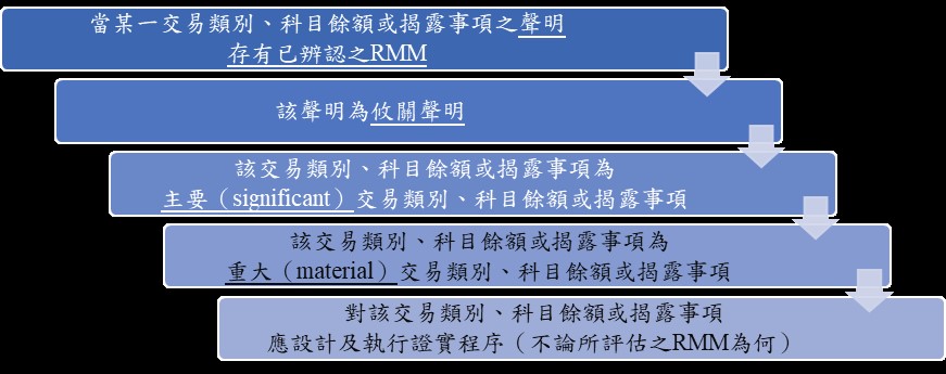 4.查核人員應辨認存在於整體財務報表層級或個別項目聲明層級之RMM,並決定攸關聲明與相應之主要交易類別、科目餘額或揭露事項。請詳下列圖二 攸關聲明與主要或重大交易類別、科目餘額或揭露事項之關聯性及查核因應。