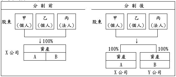 1.甲、乙、丙共持有X公司100%股份(各分別30%、30%、40%),X公司有A、B二部門,B部門之資產將分割予新設公司-Y公司