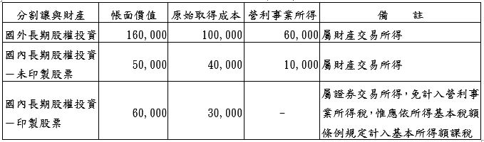 2.上述分割讓與之資產中,國外長期股權投資及國內長期股權投資之投資標的非屬證券交易稅條例規定之有價證券者,應按分割時帳面價值(包括採權益法認列之投資收益)減除原始取得成本,計算財產交易所得課稅;國內長期股權投資之投資標的屬證券交易稅條例規定之有價證券者,應按分割時帳面價值減除原始取得成本計算證券交易所得,依所得基本稅額條例規定,計入基本所得額課稅。