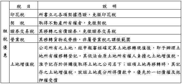 內 容:公司進行分割或依企併法第二十七條至第三十條規定收購財產或股份,而以有表決權之股份作為支付被併購公司之對價,並達全部對價百分之六十五以上,或進行合併者,其租稅優惠及列管事項如(一)(二)所示