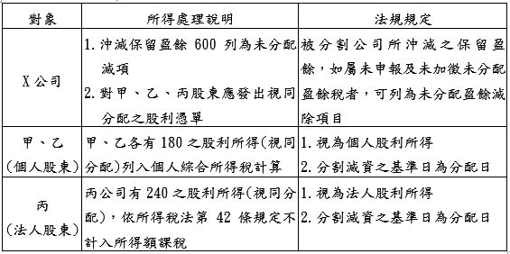 說 明:1.被分割公司依旨揭會計處理所沖減之保留盈餘,如包括尚未申報及加徵5%營利事業所得稅之上年度盈餘部分,可列為計算所得稅法第66條之9規定該年度未分配盈餘之減除項目;該沖減之保留盈餘應視為被分割公司分配予股東之股利所得(投資收益),依規定課徵所得稅,並以分割減資之基準日為分配日。