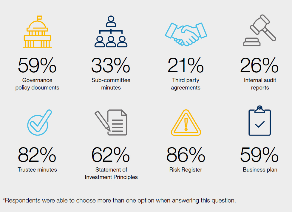 In 2019, 86% and 82% of respondents confirmed that they use the risk register and Trustee minutes to document areas of the assessment of governance.
