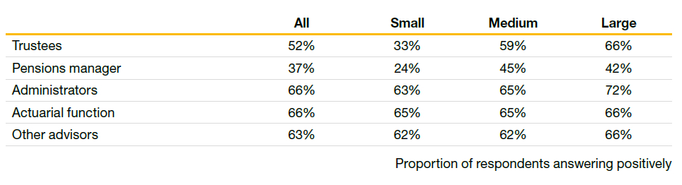It was encouraging to see that in 2019, 78% of respondents already assessed the system of governance at least every three years. Based on our experience, we would argue that for a proportion of the remaining respondents, the system of governance at these schemes is assessed on a regular basis but the process is not formally documented.