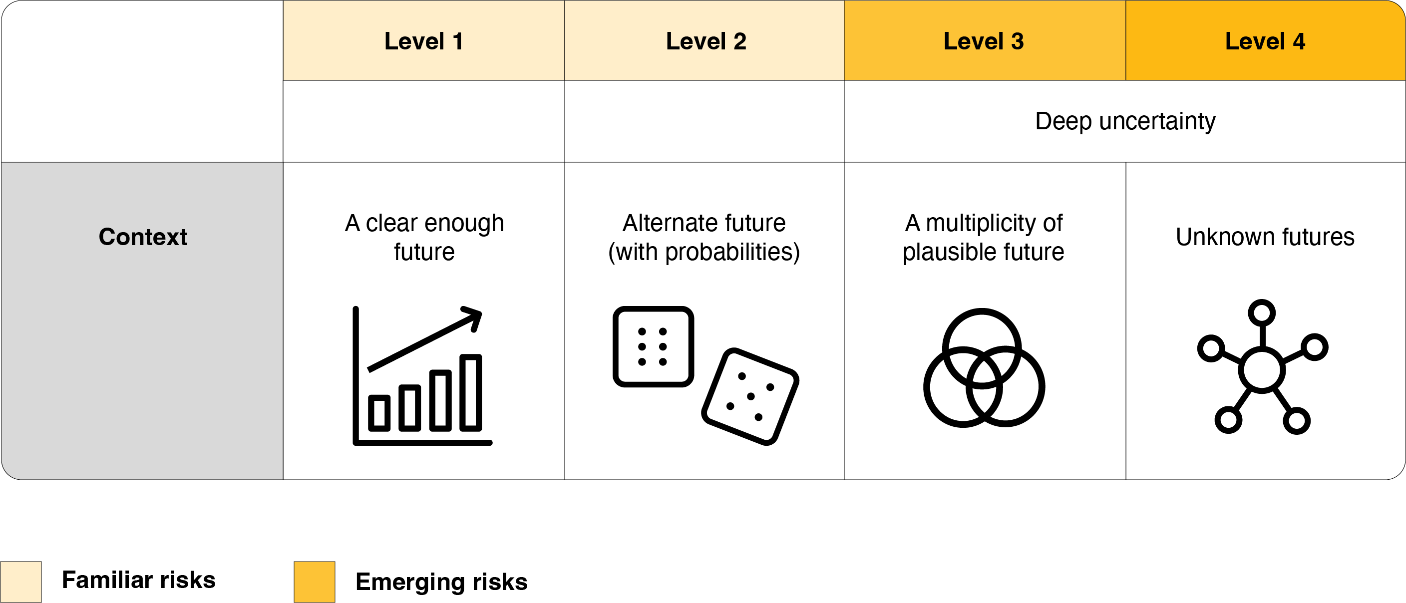 As seen in the diagram below, anticipating and exploring uncertain futures is more difficult than where risks are more familiar.