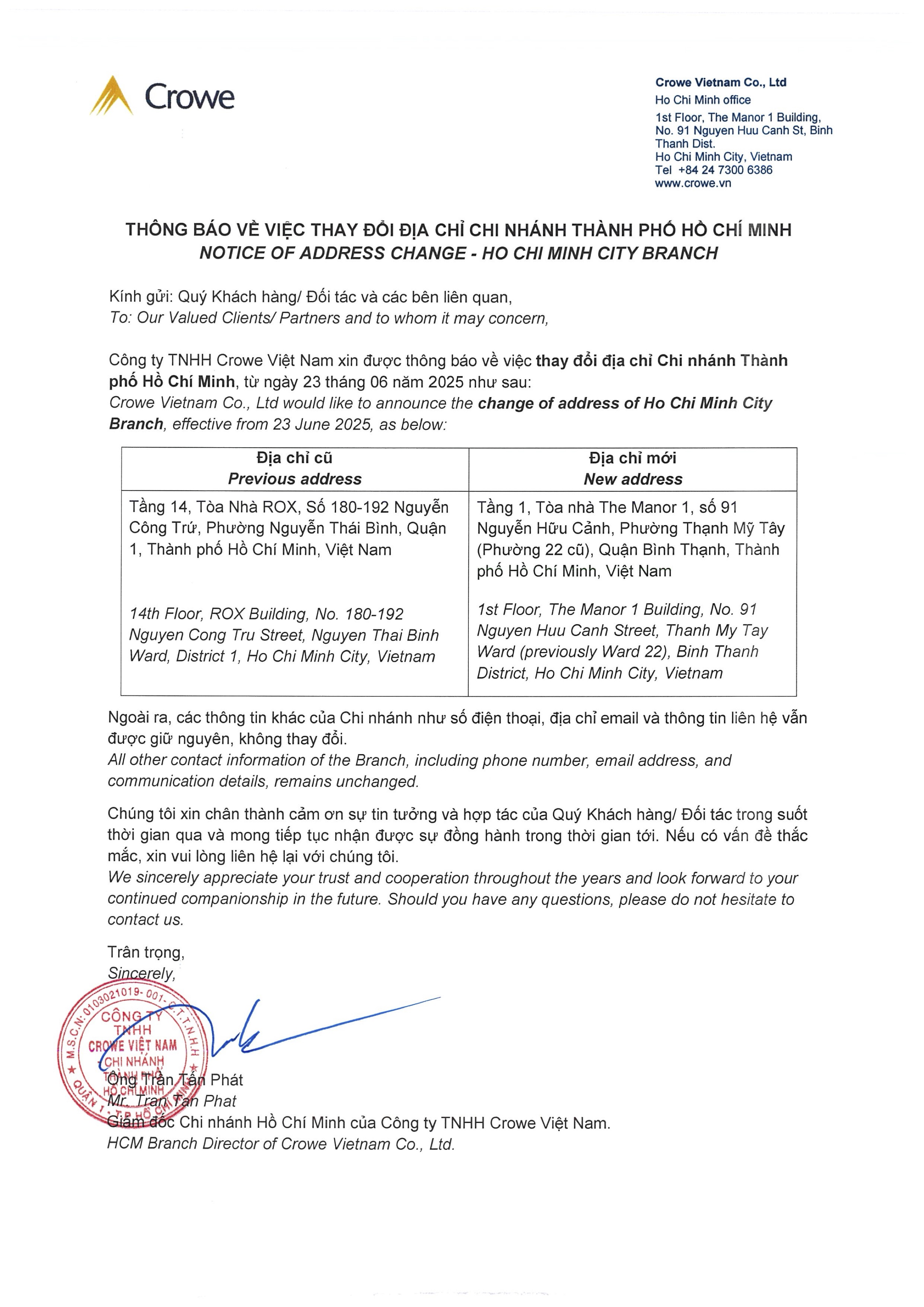 Crowe Vietnam would like to inform you that, effective from 23 June 2025, our Ho Chi Minh City Branch will be relocated to the following new address: