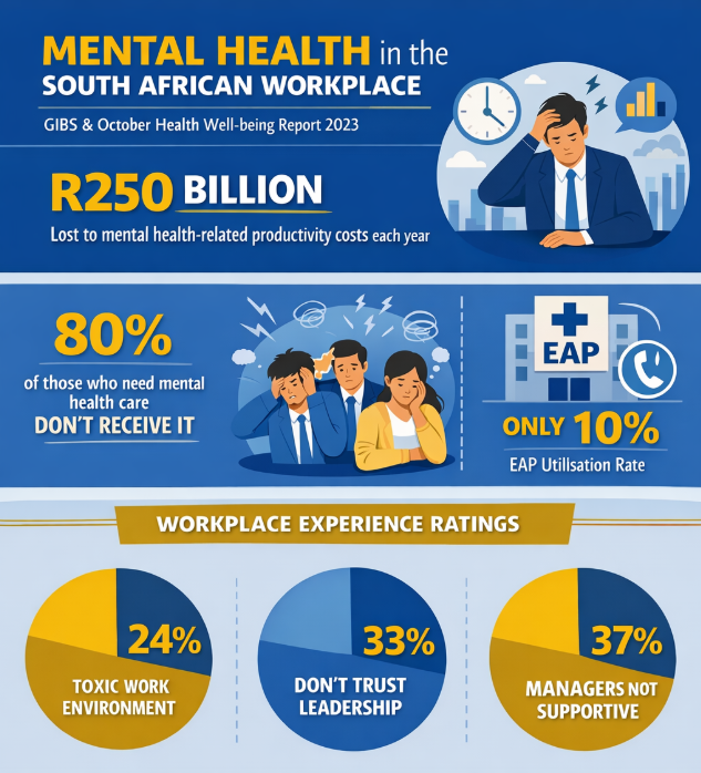 “An estimated 80% of people who need mental health care do not get it.” (GIBS) The GIBS x October Health Workplace Well-being Report points to a hard economic reality: mental health challenges are estimated to cost South Africa about R250 billion a year in lost productivity (largely from absenteeism and presenteeism), with knock-on effects on GDP.